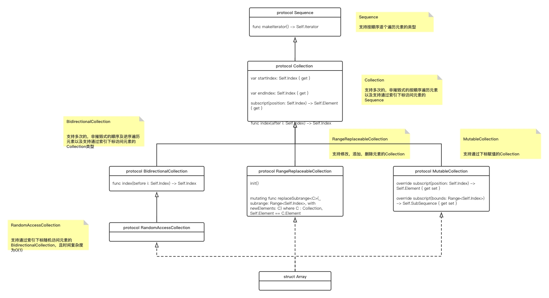 当元素类型为 class 或者 @objc protocol, NSArray 桥接为 Array 首先调用 copy(with:) 方法获得一个可变的拷贝数组,然后执行额外的Swift保存操作,将会消耗O(1)的时间复杂度。如果是 NSMutableArray 对象桥接为Array ,copy(with:)通常会在O(1)时间内返回同一个数组对象,否则copy的性能将是不确定的。如果copy(with:)返回同一个数组对象,NSArray 和 Array 共享同一块支持写实拷贝的存储空间。