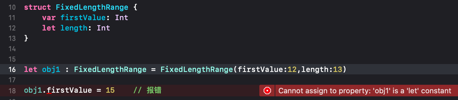 常量的结构体实例中的属性,无论是常量还是变量都不可以修改
