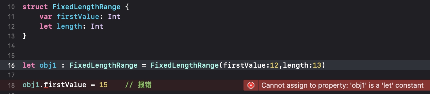 let obj1 : FixedLengthRangeStruct = FixedLengthRangeStruct(firstValue:12)