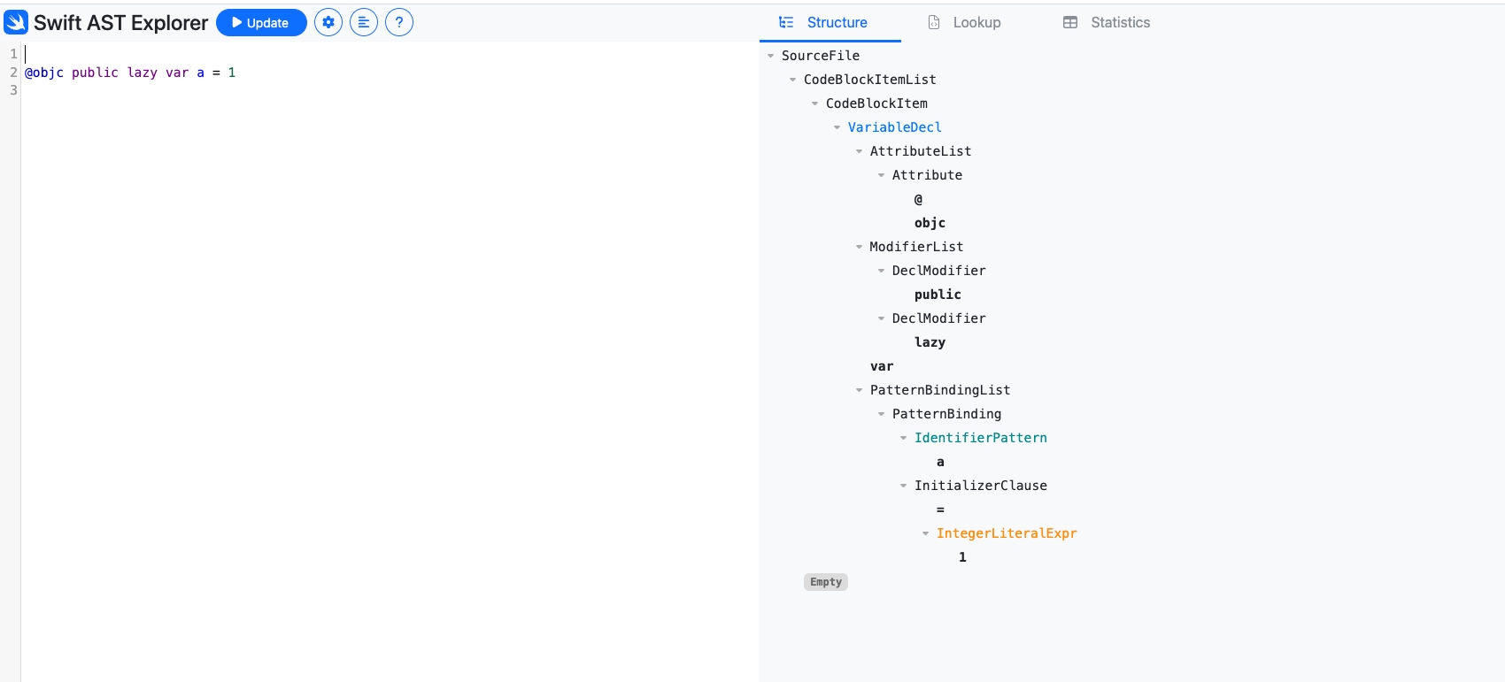 在 Swift AST Explorer 工具中,可以直观地看到源码的语法树,辅助我们开发自定义的Swiftlint 规则