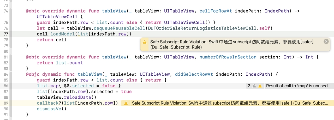 以代码中经常使用的数组下标访问代码为例,在我司推荐使用安全访问方法 array[safe: index],这个方法可以规避数组越界导致的闪退问题 ; 针对这种情况,我们定义规则如下: